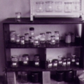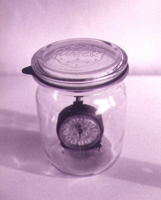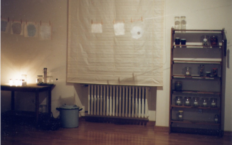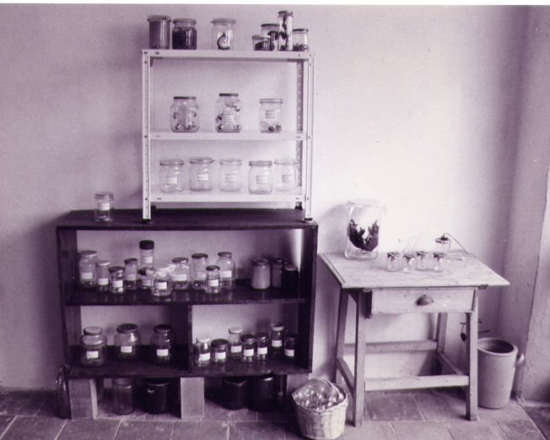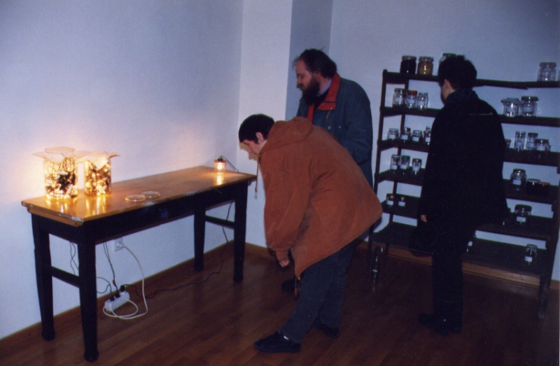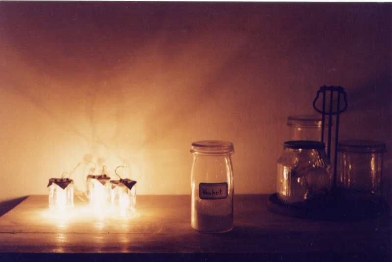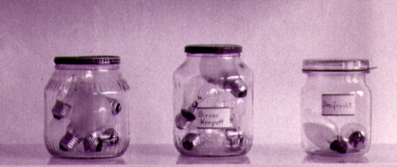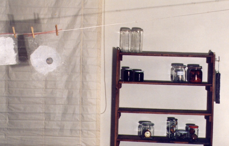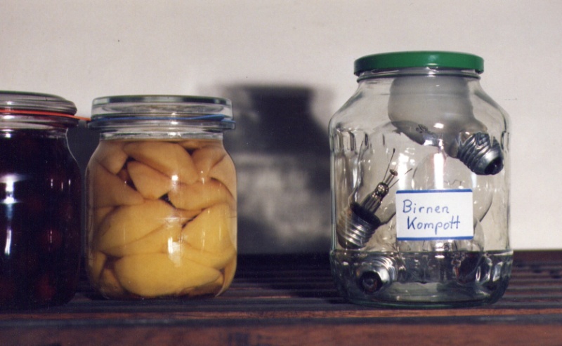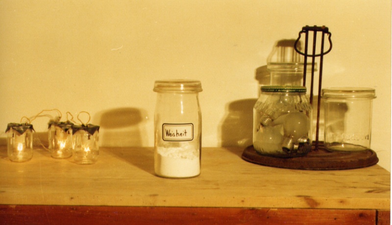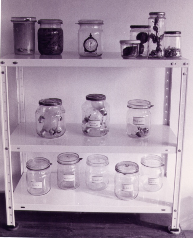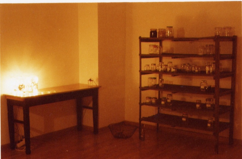 Playing with the double meaning of words Marlis Leue has conserved “al baño María" attitudes and sentiments which, in real life, hardly exist any more, and she stores them in an installation representing a basement like those of her childhood, where people stored products from their gardens and orchards for hard winters or “bad times.” |