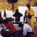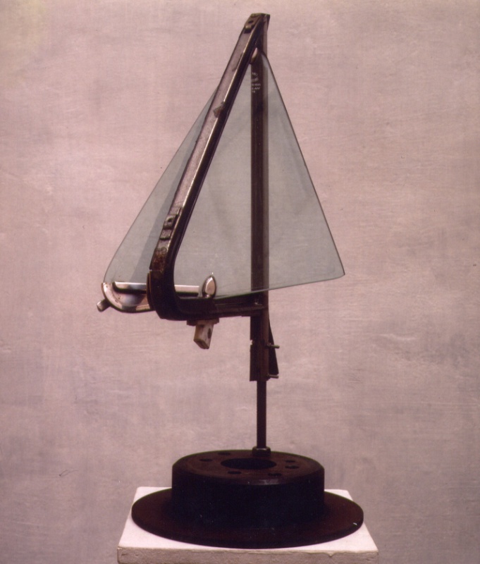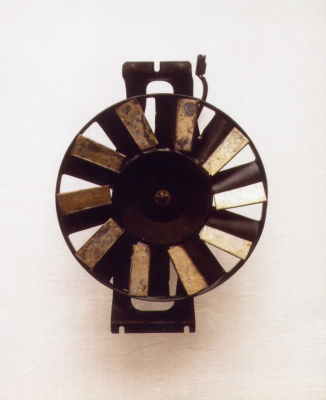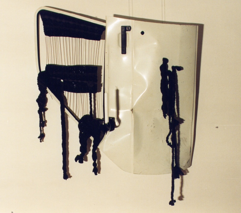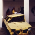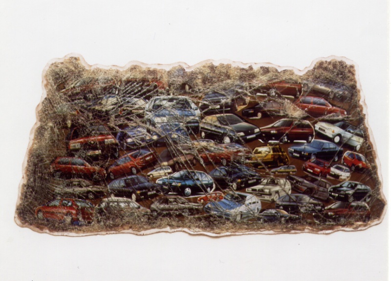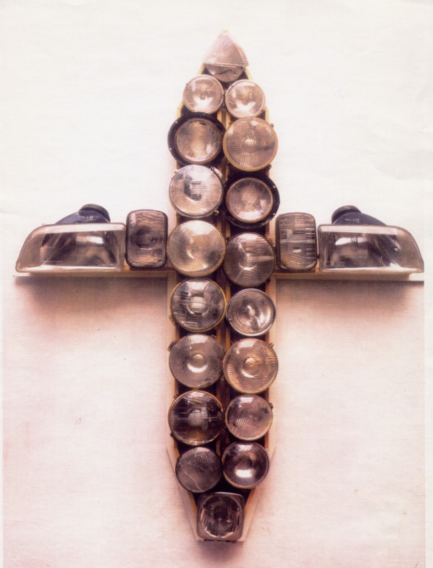 “...Marlis Leue, has confronted this eternal and affable architecture with used auto parts. On the bulletin board at the entrance we find official lists of traffic mortalities, flanked by old tires which double as flower coronas. On the access path to the chapel various traffic signs and two wrecked cars simulate an accident. And in the chapel, a multitude of sculptural pieces created out of automobile fragments. In some cases the author has combined pieces of ceramics created for the occasion and elements related to alcohol.”